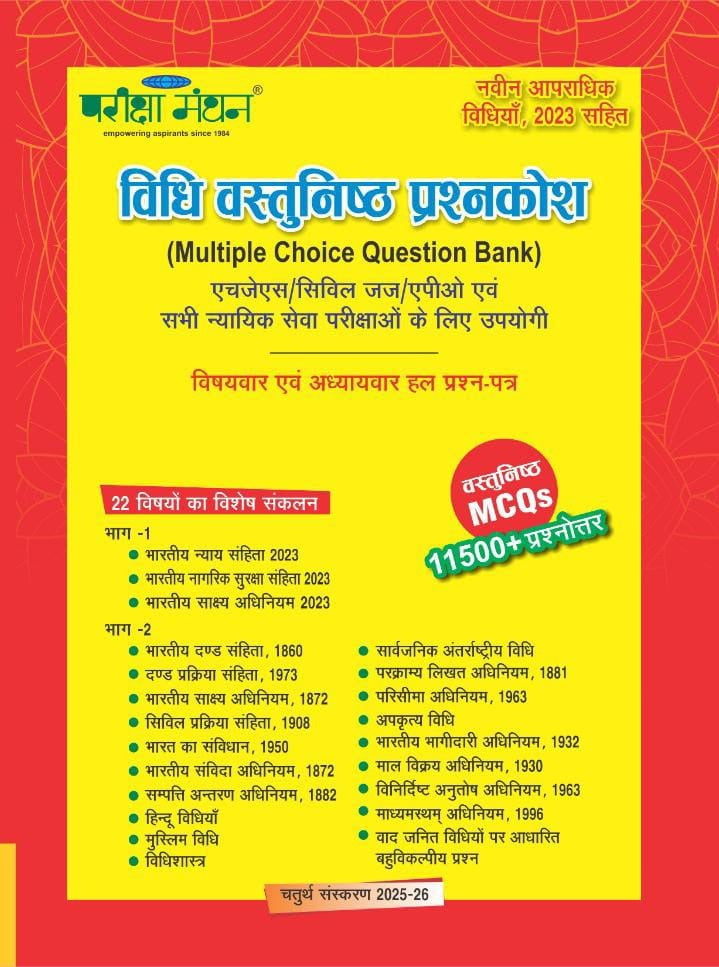Pariksha Manthan Vidhi Vastunishth Prashnkosh 2025-2026 is the 4th and latest edition in Hindi medium, specially curated for judicial service aspirants. This book provides 11500+ chapterwise objective law questions ideal for Civil Judge, HJS (Higher Judicial Services), APO (Assistant Prosecution Officer), and other judicial competitive exams.