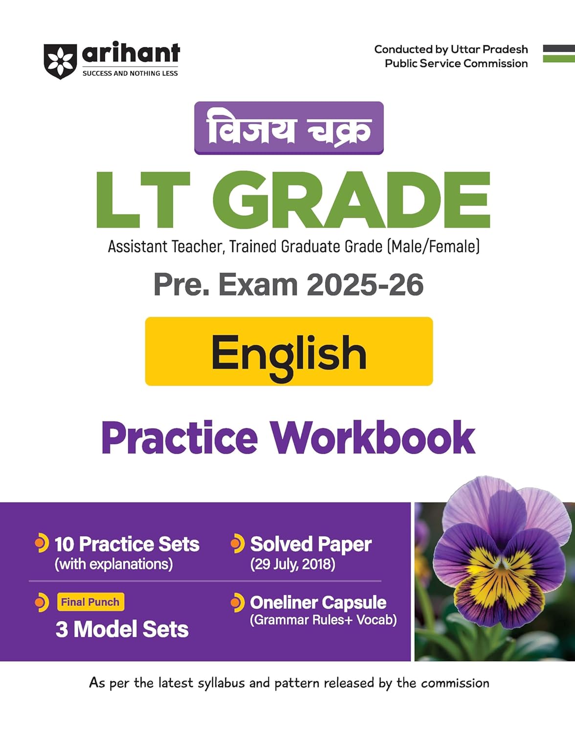 Arihant UPPSC LT Grade Prelims Exam 2025-2026 Vijay Chakra English Practice Workbook is a complete guide for candidates preparing for the Uttar Pradesh LT Grade Teacher Recruitment Examination. It provides practice sets, solved papers, and exam-oriented exercises based on the latest syllabus and exam pattern.