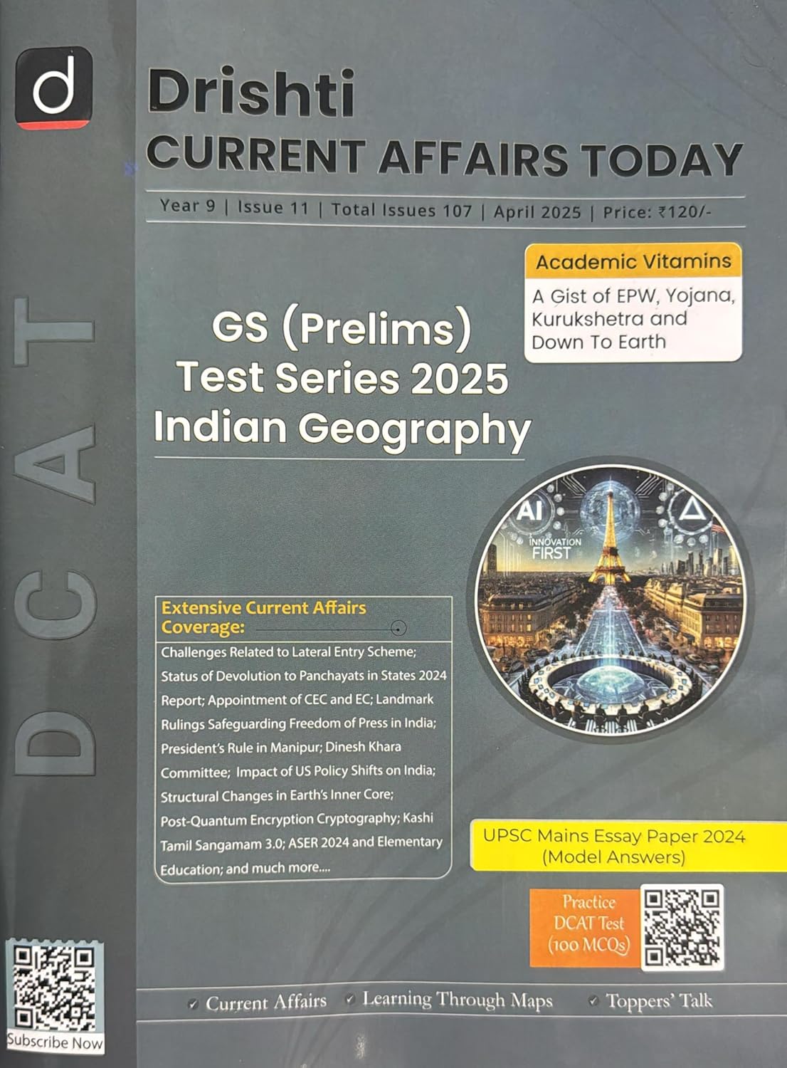The Drishti Current Affairs Today April 2025 is a comprehensive English monthly magazine featuring key national and international events, exam-oriented news, and government schemes. Perfect for UPSC, State PCS, SSC, Banking, and other competitive exams.
