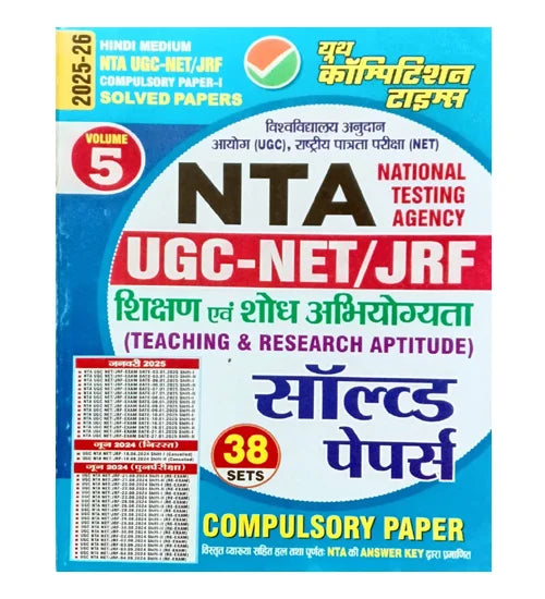 Youth NTA UGC NET JRF 2025–2026 Volume 5 is a comprehensive practice resource containing 38 Solved Papers for Paper-1 (Teaching and Research Aptitude), specially curated in Hindi Medium for UGC NET aspirants.